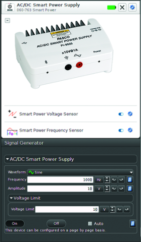 Inteligentní zdroj AC/DC je ovládán pomocí softwaru PASCO Capstone nebo SPARKvue. Možnost ovládat tento zdroj napájení přes Bluetooth umožňuje uživatelům Chromebooků či zařízení se systémy Android a Apple iOS provádět experimenty s bezdrátovými senzory, které vyžadují zdroj